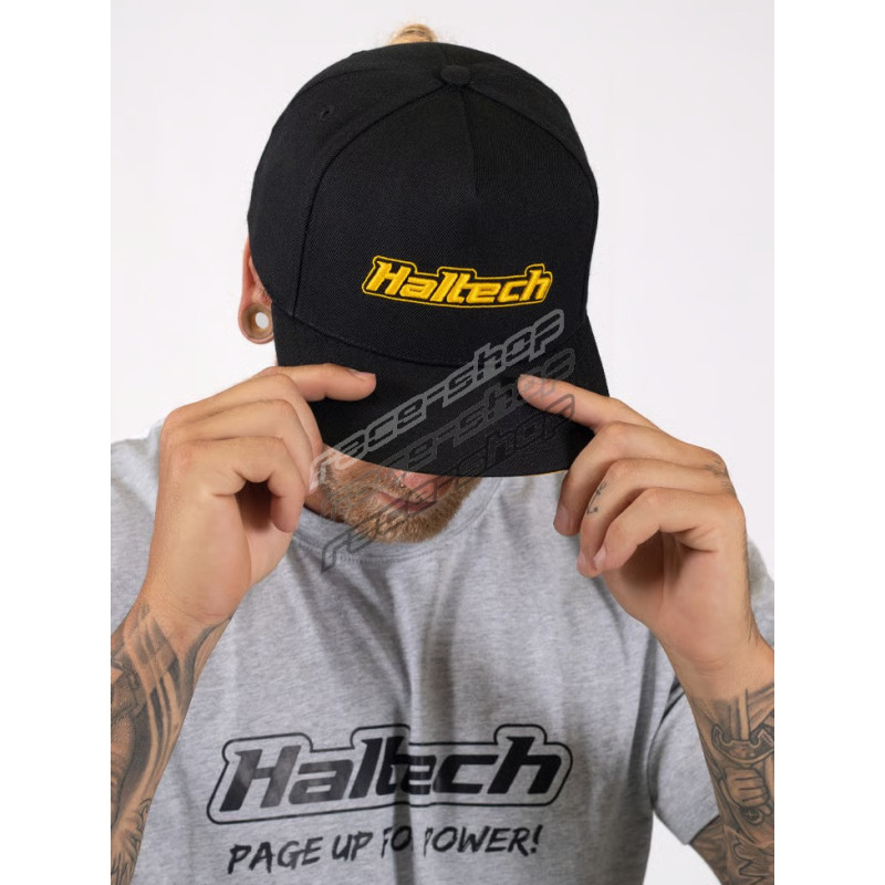 A subtle, black and yellow writing snapback cap from Haltech, finished with bold 3D front embroidery and refined branded details.