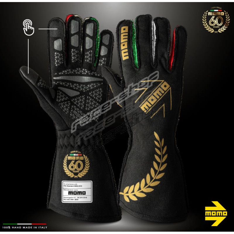 Rukavice Corsa Pro Anniversario zdobené zlatými logami, ktoré žiaria nadčasovým leskom, vzdávajú hold odkazu precíznosti a úspechu značky Momo. Skutočne ich však odlišuje trojfarebná talianska vlajka starostlivo našitá na prstoch, ktorá je poctou bohatému talianskemu dedičstvu značky a jej neochvejnému záväzku voči kvalite.