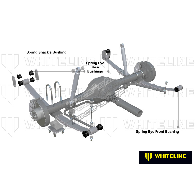 Kompletná sada silentblokov pre listové pružiny, ktorá zahŕňa predné a zadné čapy pružín a silentbloky závesov. Vysoký počet najazdených kilometrov a zaťaženie spôsobujú nadmerné opotrebenie gumových silentblokov. Čierne puzdrá Whiteline sú odolné a ponúkajú vynikajúcu odolnosť proti oderu, vysokú nosnosť (4WD, úžitkové vozidlá a ťahanie), flexibilitu, zvýšenú pevnosť v ťahu a chemickú odolnosť voči oleju, mastnote, ozónu a poveternostným vplyvom.