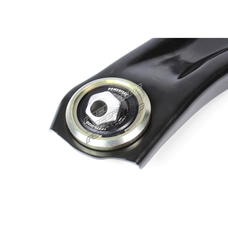 PFF76-902G Predná vahadlová objímka zadnej nápravy bola navrhnutá na základe jedinečnej kombinácie nylonu a polyuretánu s nastaviteľným guľovým kĺbom, ktorú špeciálne navrhla spoločnosť Powerflex pre priamejšie riadenie a lepšie zatáčanie a brzdenie. Posunutý otvor umožňuje nastavenie kolieska až o 0,5° pomocou dodaného kľúča, ktorý pomáha pri jemnom doladení nastavenia kolieska do strán, a obsahuje aj 5 mm ochranu proti zdvihu. Vertikálna tuhosť je oproti štandardnej gume zvýšená o 250 %.